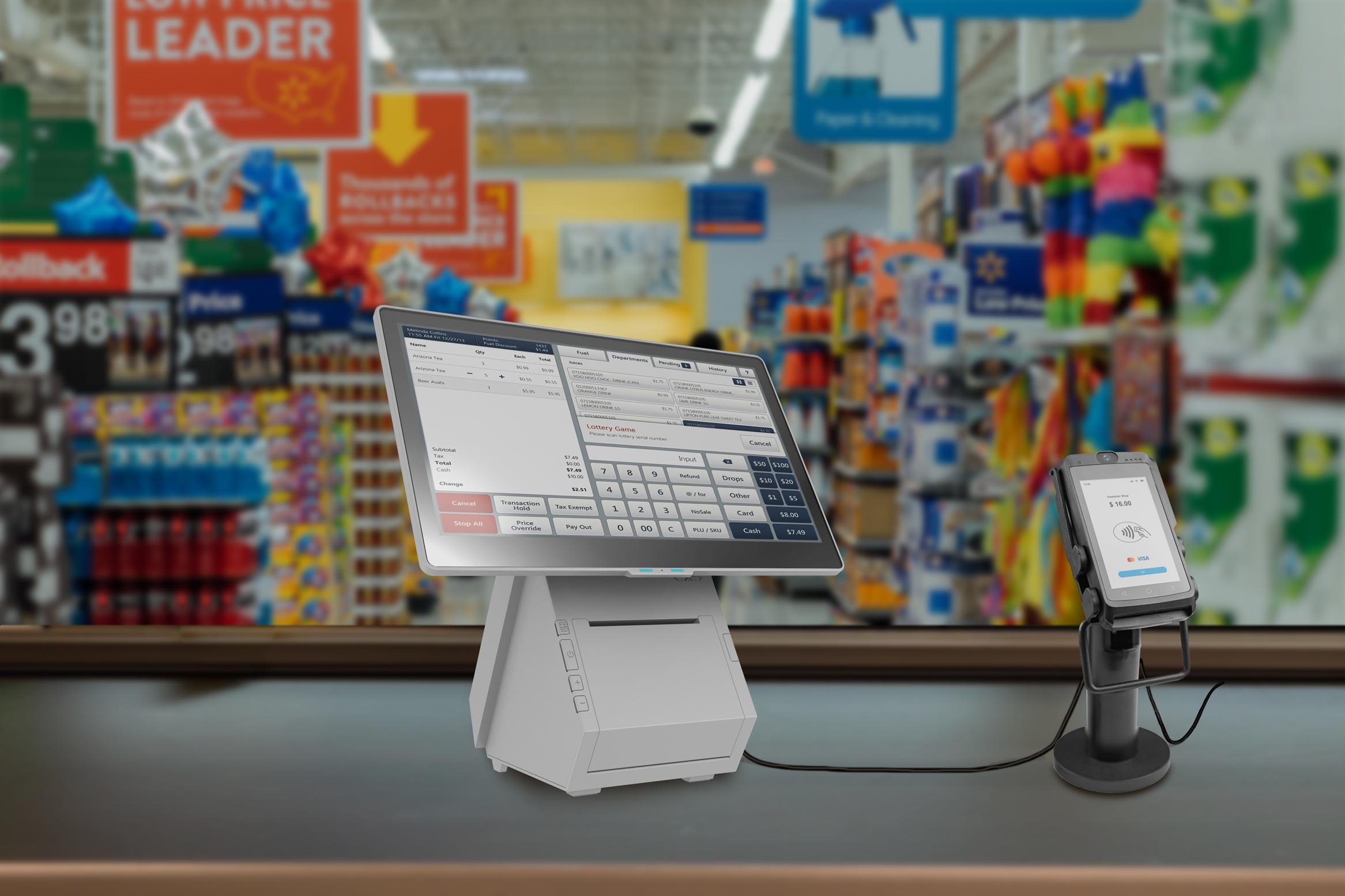 Kasa płatnicza D3 z modułem płatności Q3. Mocowana przy ladzie. Wyposażona w jeden lub dwa ekrany, oraz drukarkę termiczną zamontowaną w podstawie kasy. |